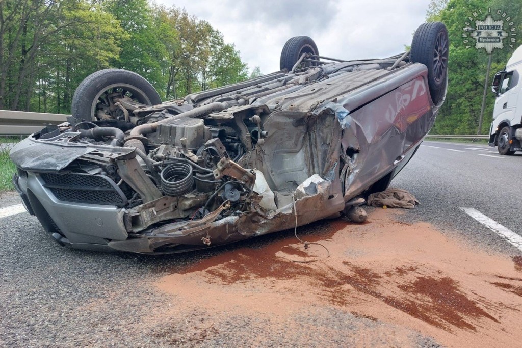 Jak informuje mysłowicka policja do zdarzenia doszło tuż po godzinie 9:00 na drodze S1 na wysokości zjazdu na Imielin w kierunku Tychów (552 km). Ze wstępnych ustaleń wynika, że kierujący osobową alfą romeo zmieniając pas z lewego na prawy, doprowadził do kolizji z naczepą pojazdu ciężarowego, w wyniku czego samochód osobowy dachował.