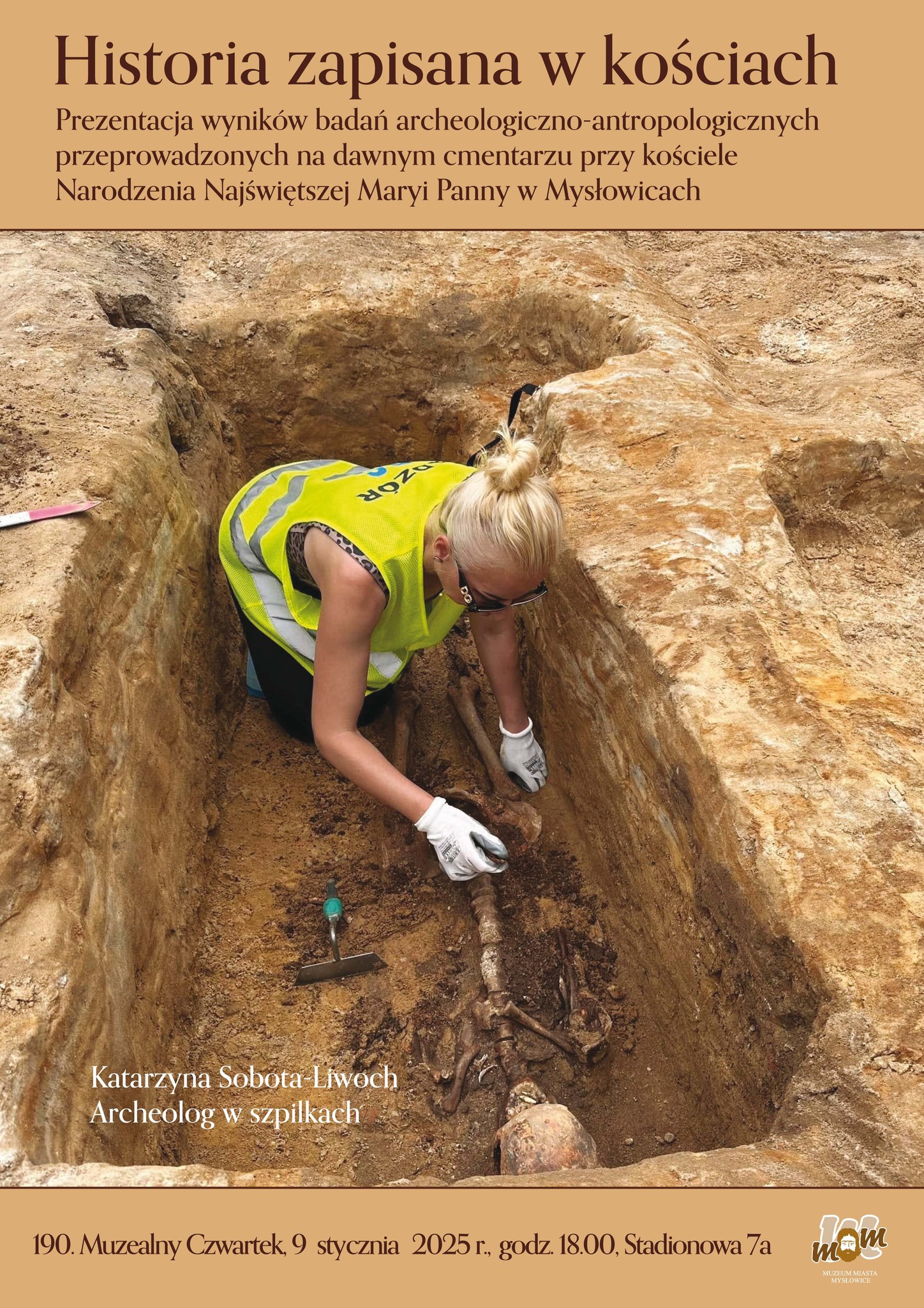 9 stycznia o godz. 18:00 w Muzeum Miasta Mysłowice odbędzie się już 190. spotkanie w ramach muzealnego czwartku pt. „Historia zapisana w kościach”. Gościem specjalnym będzie Katarzyna Sobota-Liwoch, znana jako Archeolog w Szpilkach, która prowadziła badania archeologiczno-antropologiczne w naszym mieście.
