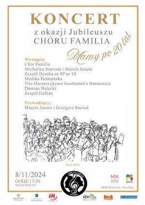 Dlatego podczas październikowej sesji rady miasta, radni podjęli uchwałę o przyznaniu tytułu zasłużonej dla miasta Mysłowice. Prezentację projektu przedstawił były prezydent oraz wieloletni członek chóru Familia, Edward Lasok. Uroczyste nadanie tytułu odbędzie się 8 listopada o godz. 17:30 w Kultowym Kinoteatrze Znicz, podczas sesji nadzwyczajnej połączonej z jubileuszem 20-lecia chóru Familia. Oprócz jubilatów tego dnia wystąpią również Michalina Starosta i Marcin Janota, zespół Dyszka z SP10, Monika Hetmańska, trio harmonijkowe Gentlemen’s Harmonica, Damian Holecki oraz zespół Galhan. Wstęp na wydarzenie jest wolny.