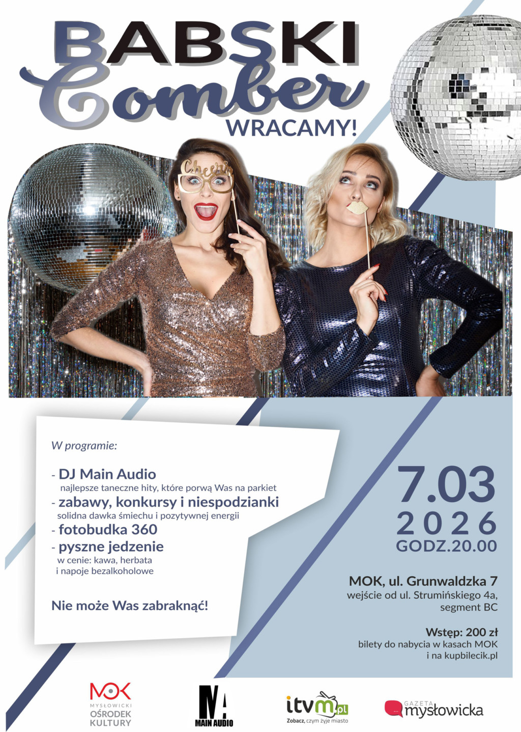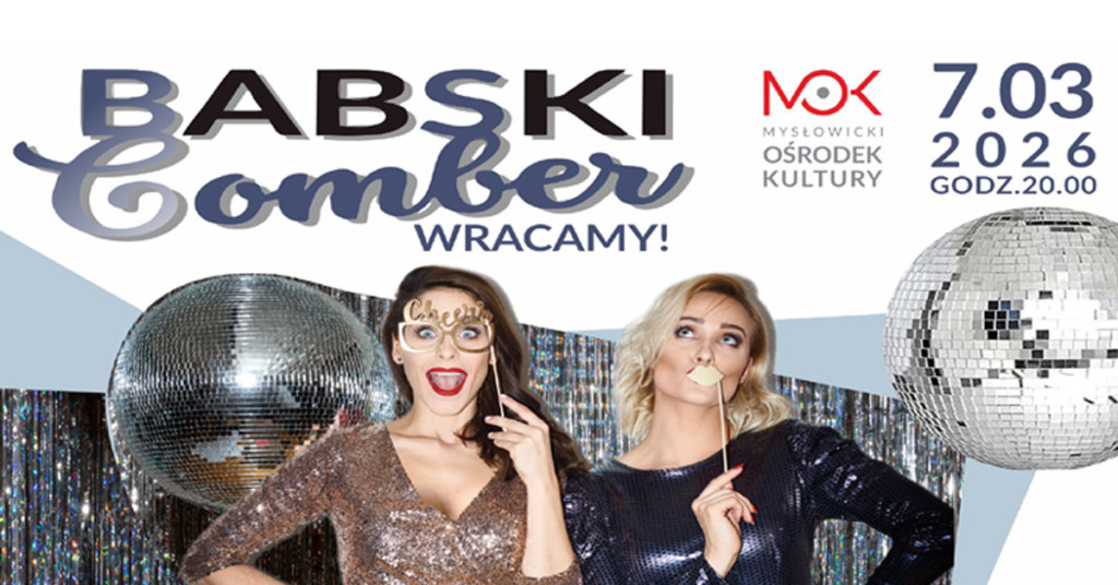 Po przerwie do Mysłowickiego Ośrodka Kultury powraca wydarzenie, na które czekały setki uczestniczek – Babski Comber! Już 7 marca 2026 roku ponownie spotkamy się na najbardziej kobiecej, szalonej i roztańczonej imprezie roku. Start wydarzenia o godz. 20:00 w MOK przy ul. Grunwaldzkiej 7 (wejście od ul. Strumińskiego 4a).