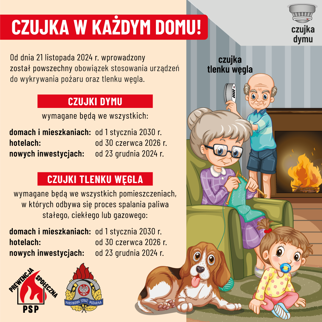 – Przypominamy, że od 21 listopada 2024 r. jest obowiązek wyposażania mieszkań w urządzenia do wykrywania pożaru w użytkowanych domach i mieszkaniach od 1 stycznia 2030 r. a nowe inwestycje od 23 grudnia 2024 r. Czujki tlenku węgla wymagane są we wszystkich pomieszczeniach, w których odbywa się proces spalania paliwa stałego, ciekłego lub gazowego od 1 stycznia 2030 r. a nowe inwestycje od 23 grudnia 2024 r. Upewnij się, że czujka posiada znak budowlany B i spełnia wymagania polskiej normy PN-EN 50291-1:2018. Pamiętaj, że czujka ma ograniczony czas działania i w zależności od zaleceń producenta po roku czy kilku latach może być konieczna wymiana czujki na nową. Będąc posiadaczem czujki dbaj o jej sprawność poprzez okresową wymianę baterii i prowadzenie testów jej działania zgodnie z zaleceniami producenta – mówi Chojnowski.