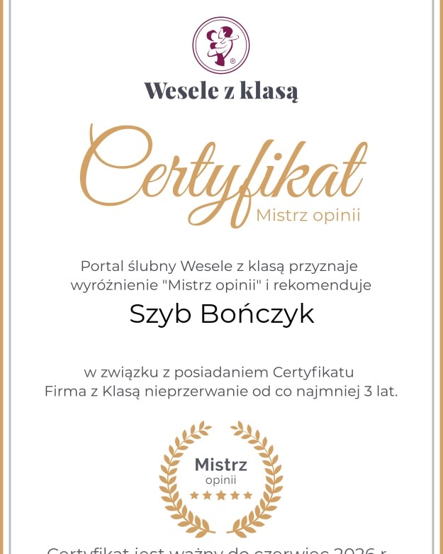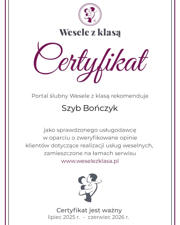 Restauracja Szyb Bończyk po raz kolejny została uhonorowana Certyfikatem Firmy z Klasą oraz prestiżowym wyróżnieniem Mistrza Opinii, przyznawanymi przez portal ślubny Wesele z klasą.