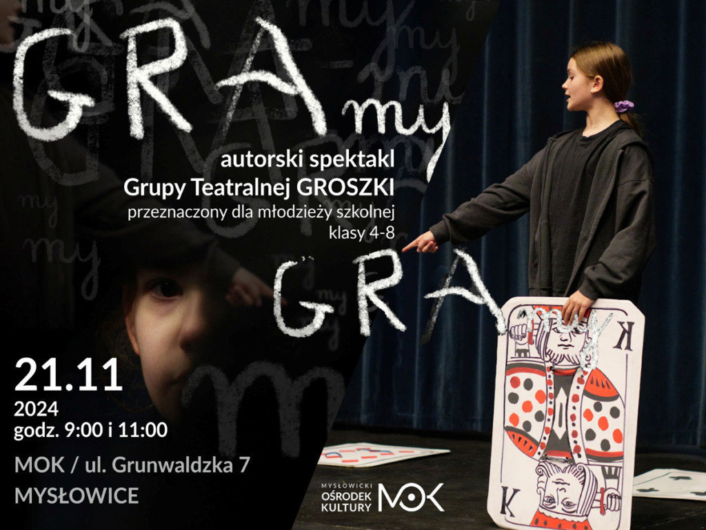 Grupa teatralna Groszki, pod opieką artystyczną Barbary Wójcik-Wiktorowicz, zaprasza uczniów szkół podstawowych do wzięcia udziału w spektaklu pt. „GRAmy”. 21 listopada w godzinach 9:00 i 11:00 w Mysłowickim Ośrodku Kultury przy ul. Grunwaldzkiej 7. Rezerwacje pod numerem telefonu: 500 186 320 lub mailowo: bwiktorowicz@m-ok.pl. Bilety w cenie 20 zł od osoby.