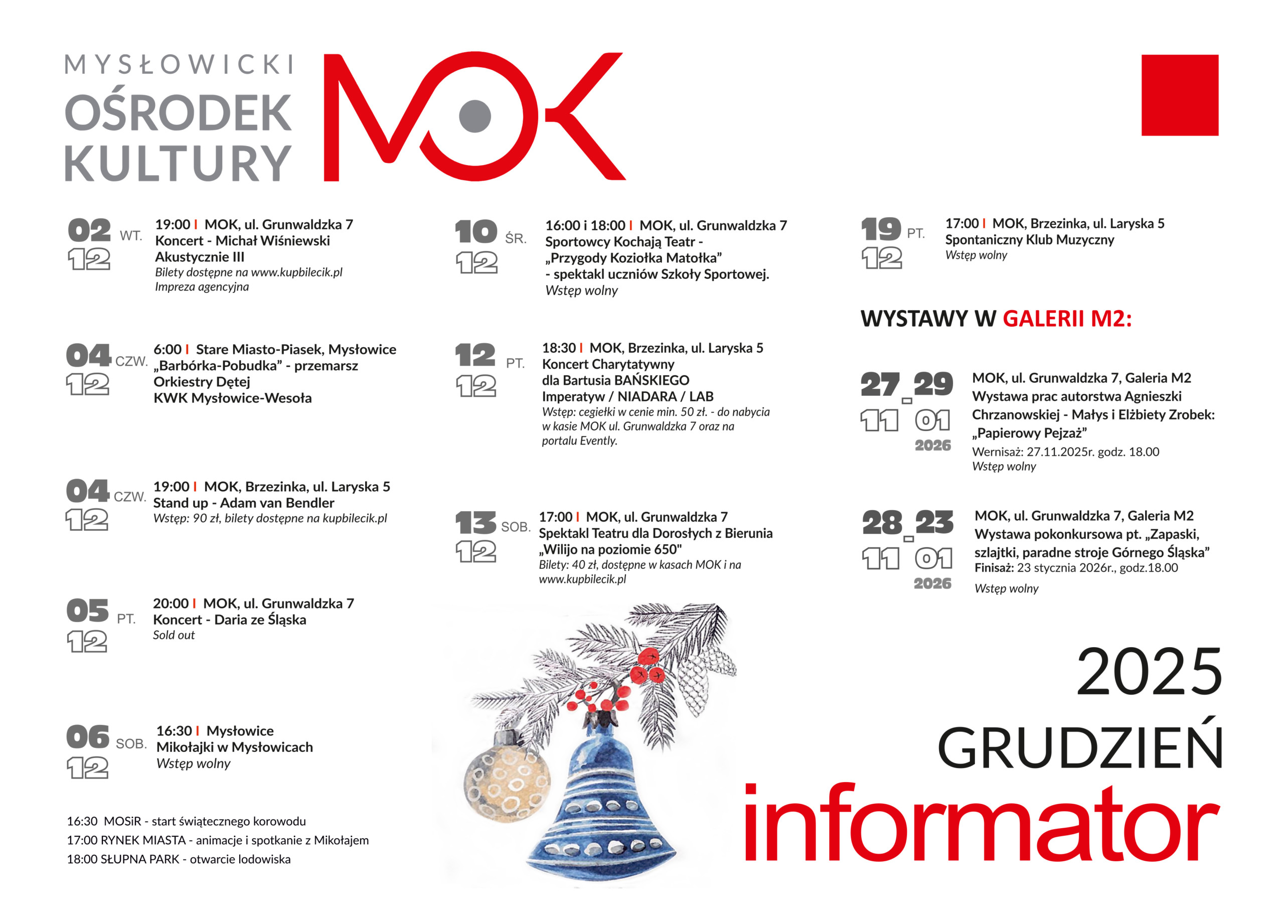 Kultura Grudzień w MOK By Aleksandra Klimek2025-12-02Less 1 min read157,0 Views Grudniowy informator Mysłowickiego Ośrodka Kultury, a w nim koncerty, spektakle, wystawy i świąteczne wydarzenia. Sprawdźcie co Was czeka w tym miesiącu. TagsinformatorkulturaMOKMysłowiceMysłowicki Ośrodek KulturyShareTweetPinShareSend Previous PostOtwarcie Galerii Liliowa w Imielinie Next PostGórnicza pobudka Przeczytaj też Przedsylwestrowa gala operetki z kindersztubą i humorem Pełna improwizacja z Bez Puenty Impro już 11 października MOK wzywa: zapisz się na zajęcia Luis i P z nowym klipem: „Młody, pamiętaj! Nigdy nie jesteś tu sam!”