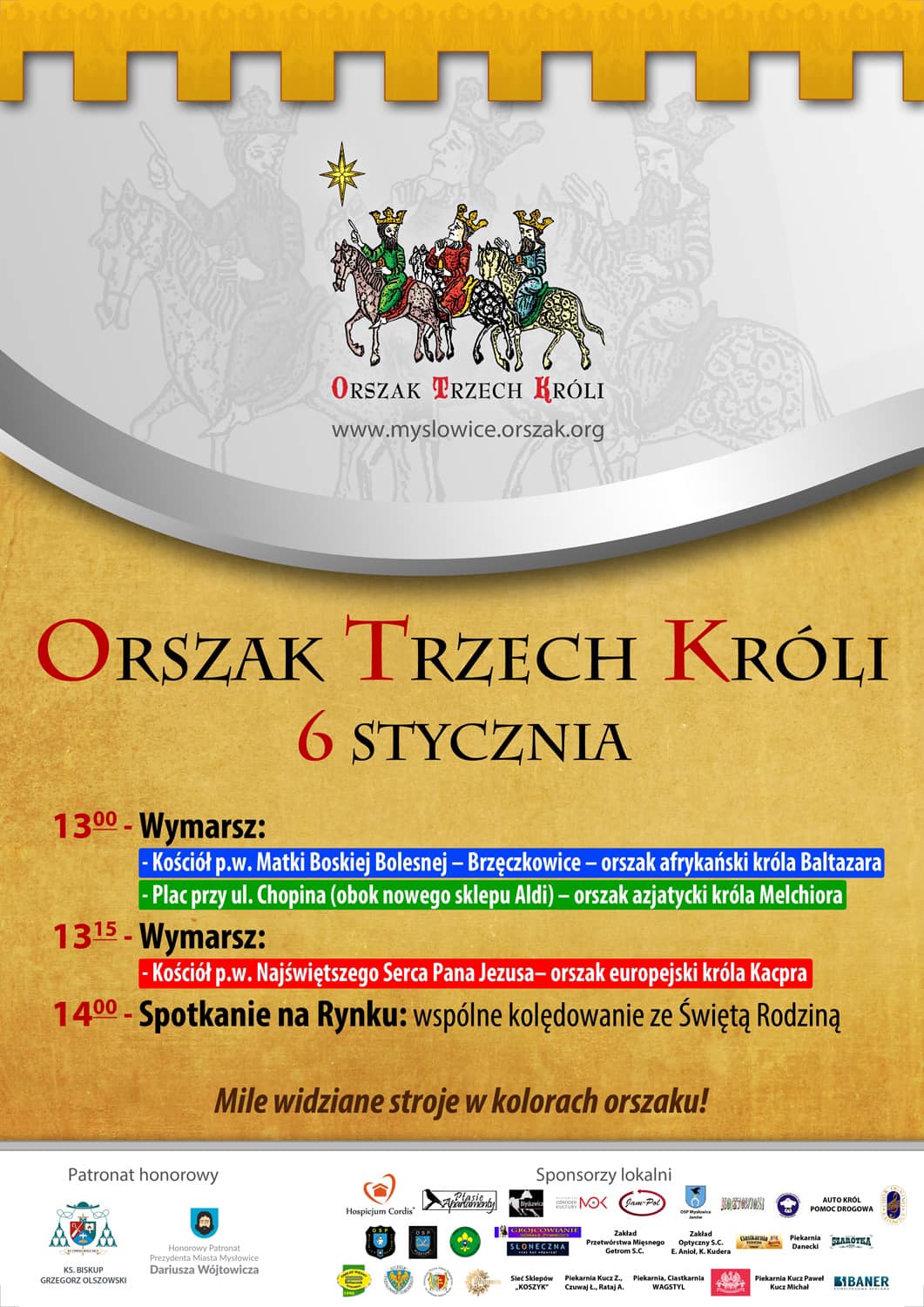 Już po raz 11. przez Mysłowice przemaszeruje Orszak Trzech Króli, a właściwie trzy kolorowe korowody. O godz. 13:00 orszak afrykański (niebieski) króla Baltazara wyruszy sprzed kościoła Matki Boskiej Bolesnej na Brzęczkowicach, a orszak azjatycki (zielony) króla Melchiora z placu przy sklepie Aldi na ul. Chopina. 15 minut później sprzed kościoła Najświętszego Serca Pana Jezusa na Starym Mieście wystartuje orszak europejski króla Kacpra. Każdy z orszaków prowadzony będzie przez króla, a mieszkańcy proszeni są, w miarę możliwości, o założenie elementów stroju w określonych kolorach. Wszystkie trzy orszaki spotkają się o godz. 14:00 na rynku, gdzie tradycyjnie zaplanowane jest wspólne kolędowanie ze Świętą Rodziną.