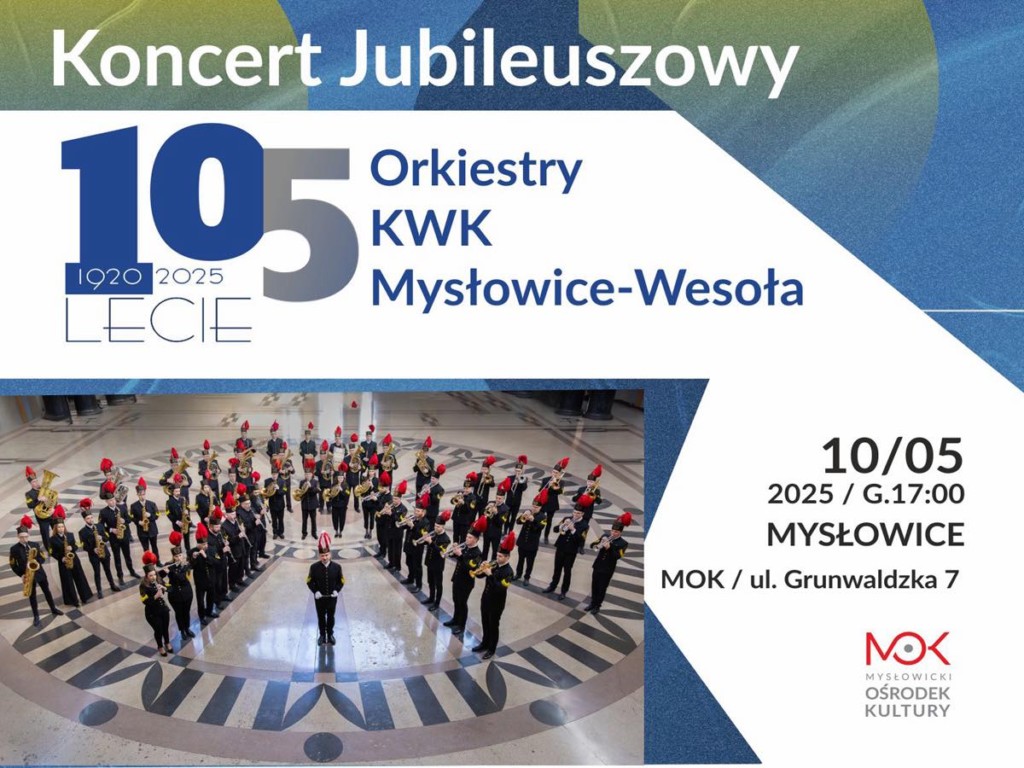 W najbliższą sobotę, 10 maja o godzinie 17:00, w Mysłowickim Ośrodku Kultury przy ul. Grunwaldzkiej 7 odbędzie się wyjątkowy wieczór pełen wzruszeń, wspomnień i doskonałej muzyki w wykonaniu jednej z najstarszych orkiestr w regionie. Górnicza Orkiestra Dęta, działająca przy kopalni KWK Mysłowice-Wesoła świętować będzie jubileusz 105 lat istnienia.
