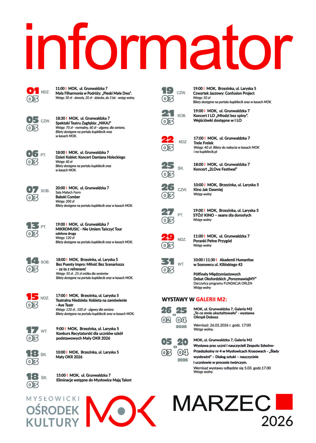 Kultura Marzec w Mysłowickim Ośrodku Kultury By Aleksandra Klimek2026-02-26Less 1 min read18,0 Views Mysłowicki Ośrodek Kultury zaprasza na wiosenne wydarzenia. Zobaczcie co Was czeka w marcu: TagsfilmkinokulturamarzecMOKMysłowicki Ośrodek KulturyteatrwydarzeniaShareTweetPinShareSend Previous PostWejdą do zimnej wody dla chorego Wojtusia Przeczytaj też Koncert organowy „Dziadek do orzechów” Warsztaty lalkowo-teatralne w MOK-u Kapibary opanują Rynek Przedsylwestrowa gala operetki z kindersztubą i humorem