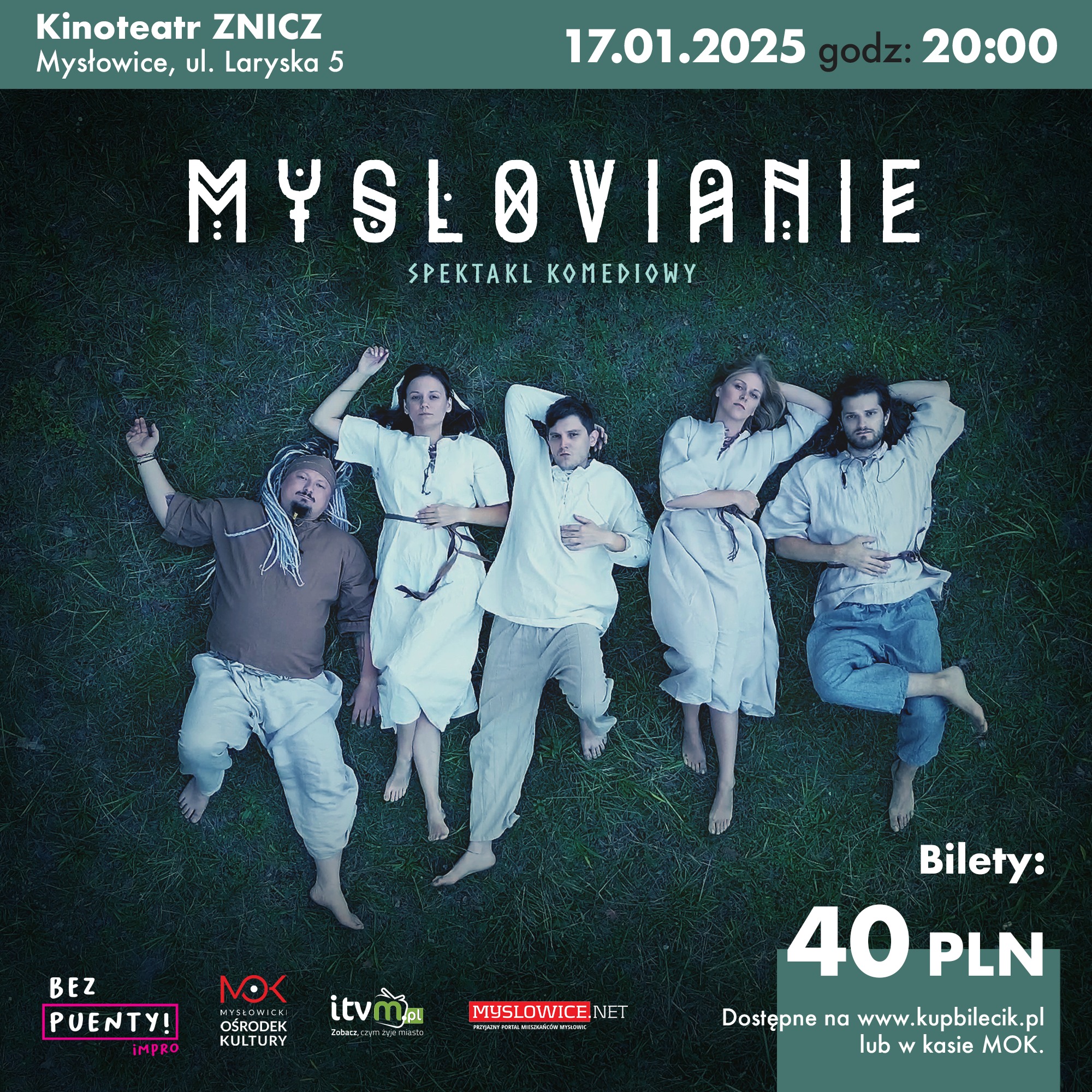 17 stycznia o godz. 20:00 w Kultowym Kinoteatrze Znicz przy ul. Laryskiej 5, odbędzie się spektakl komediowy pt. „Myslovianie” w wykonaniu Grupy Bez Puenty Impro. Jak zawsze aktorzy będą w pełni improwizować i prowadzić interakcje z widzami.