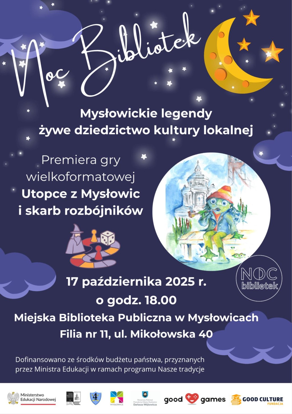 – Noc Bibliotek to coroczna, ogólnopolska akcja, która ma na celu promowanie bibliotek jako miejsc otwartych na kulturę, wiedzę i twórczość. Z każdym rokiem Noc Bibliotek zyskuje coraz większą popularność, angażując tysiące czytelników i entuzjastów literatury w całym kraju. To wydarzenie, które nie tylko bawi, ale również edukuje i inspiruje do odkrywania nowych pasji oraz budowania silnych więzi w społeczności lokalnej. Noc Bibliotek to nie tylko wspaniała okazja do spędzenia wieczoru w bibliotece, ale również szansa na poznanie nowych ludzi i dzielenie się wspólną pasją. To także świetny sposób, by w atmosferze radości i twórczości odkryć na nowo magię książek, które mogą towarzyszyć nam przez całe życie. Motyw przewodni tegorocznej edycji to „Do dzieła!” – odkryj więc, jak książki potrafią przenieść nas w najdalsze zakątki wyobraźni, jak łączą pokolenia i inspirują do działania! Przeżyj z nami niezapomnianą noc z książkami i grami planszowymi, których fabuła oparta jest na mysłowickich legendach! – zachęcają organizatorzy.