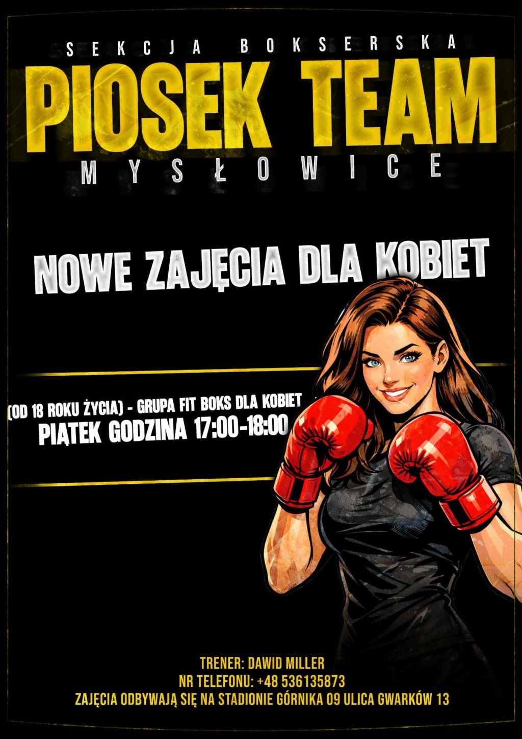 Sekcja bokserska Piosek Team Mysłowice ogłasza nabór na nowe zajęcia Fit Boks dla kobiet. Treningi są przeznaczone dla pań od 18. roku życia, niezależnie od poziomu zaawansowania – zarówno dla początkujących, jak i tych, które chcą poprawić kondycję, sylwetkę i pewność siebie.
