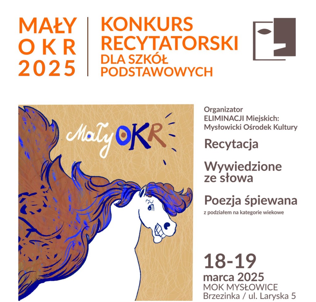 Mysłowicki Ośrodek Kultury zaprasza uczniów szkół podstawowych do udziału w Konkursie Recytatorskim Mały OKR 2025. Konkurs przeprowadzony zostanie z podziałem na kategorie wiekowe oraz repertuarowe: recytacja, wywiedzione ze słowa oraz poezja śpiewana. Uczestnicy otrzymają dyplomy, najlepsi także upominki rzeczowe.