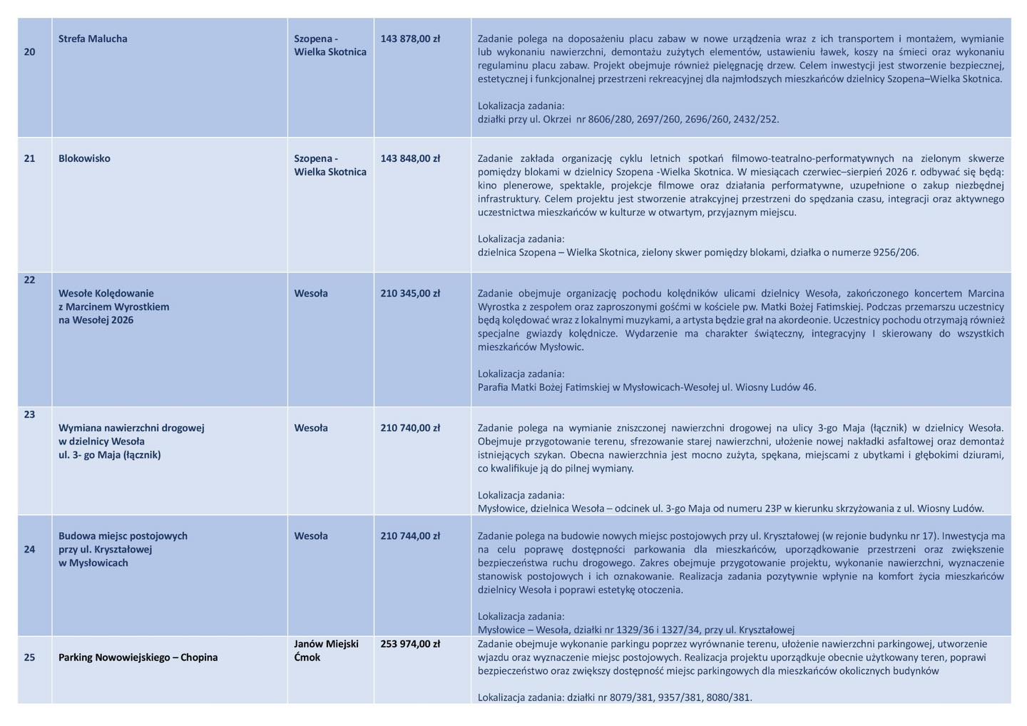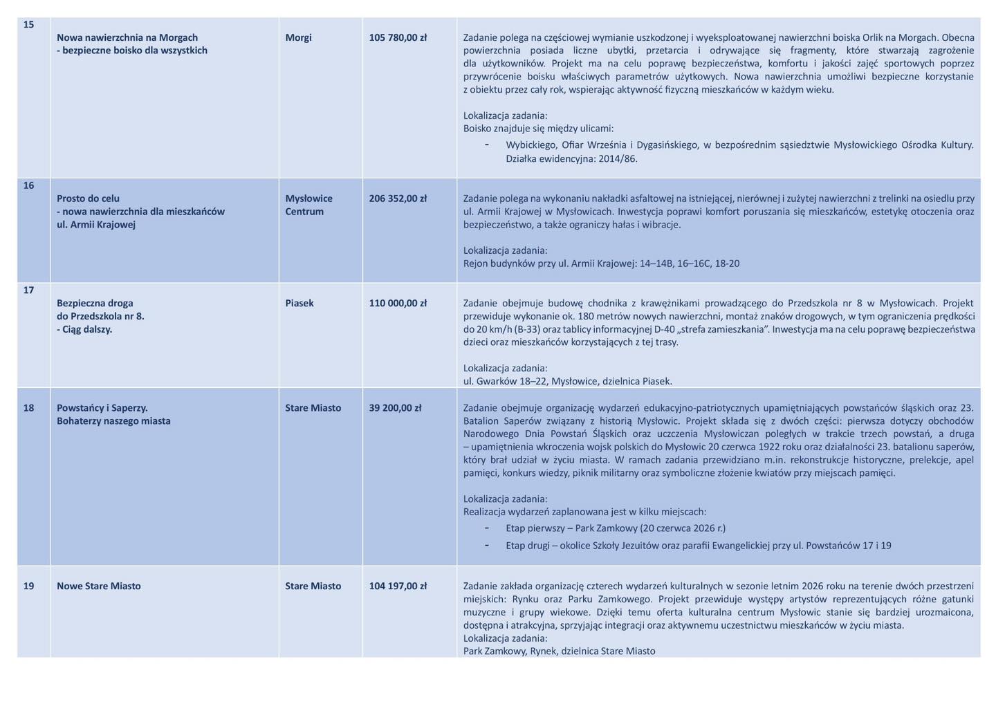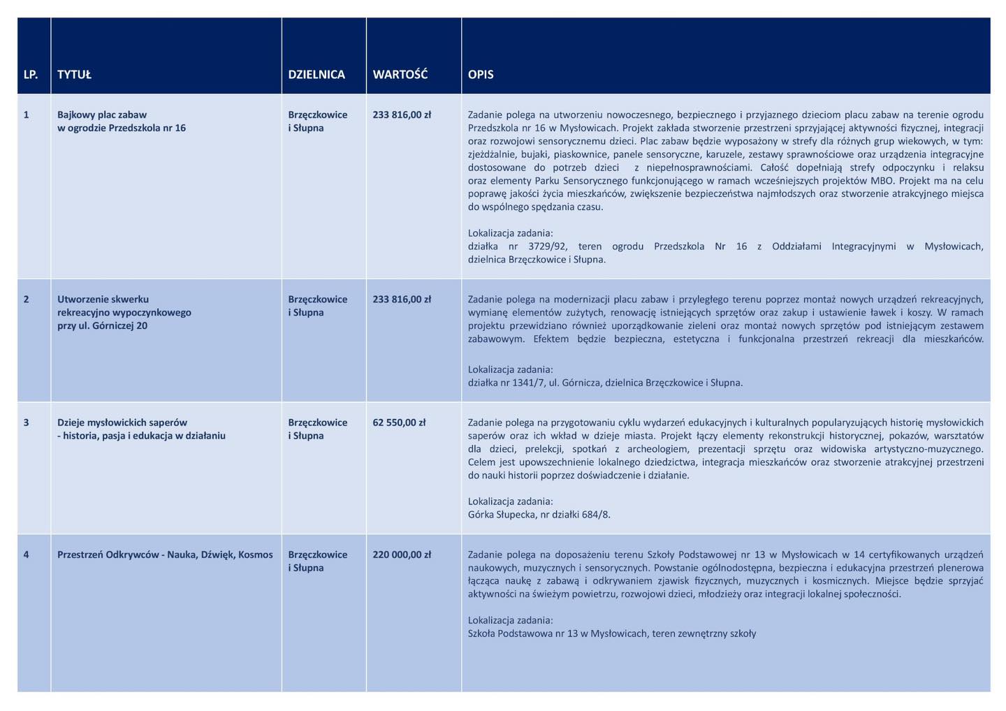 Od 9 do 16 grudnia włącznie mieszkańcy Mysłowic mogą głosować na wybrany projekt spośród 25 propozycji zatwierdzonych przez urząd miasta. Trzeba wejść na stronę www.mbo.myslowice.pl i wypełnić formularz wpisując swoje dane oraz wybierając z listy odpowiednie zadanie. Dla osób, które nie posiadają dostępu do Internetu, utworzono dwa punkty stacjonarne. Jeden z nich mieści się w Miejskiej Bibliotece Publicznej nr 1, przy ul. Laryska 5. Można tam zagłosować w dniach 09.12 – 12.12 w godz. 11:00-17:00 oraz 15.12 – 16.12 w godz. 11:00-17:00. Drugi punkt znajduje się w UrbanLab, przy ul. Grunwaldzkiej 8 i można z niego skorzystać 09.12 – 11.12 w godz. 7:30-15:30, 12.12 w godz. 7:30-14:00 oraz 15.12 – 16.12 w godz. 7:30-17:00.