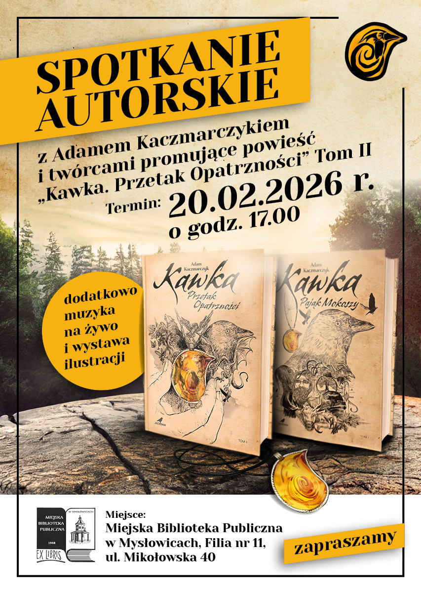 Filia nr 11 Miejskiej Biblioteki Publicznej w Mysłowicach zaprasza na spotkanie autorskie z Adamem Kaczmarczykiem, połączone z promocją drugiego tomu powieści „Kawka. Przetak Opatrzności”.