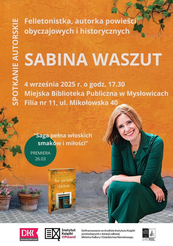 Miejska Biblioteka Publiczna w Mysłowicach (filia nr 11 przy ul. Mikołowskiej 40) zaprasza 4 września o godzinie 17:30 na spotkanie autorskie, którego gościem będzie Sabina Waszut – polska pisarka i felietonistka. W trakcie wydarzenia będzie można nie tylko otrzymać autograf, ale przede wszystkim porozmawiać o twórczości i książce autorki pt. „Noc pachnie chlebem”, która jest pierwszym tomem sagi o włoskiej rodzinie Consonni. Z kolei 10 września ukaże się drugi tom pt. „Poranki smakują kawą”. Na spotkaniu będzie można zakupić książki pisarki.