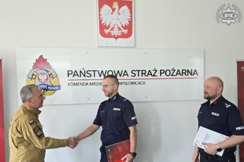 Komendant Miejski PSP w Mysłowicach docenił zaangażowanie mysłowickiego policjanta w zabezpieczenie miejsca zagrożenia wybuchem gazu